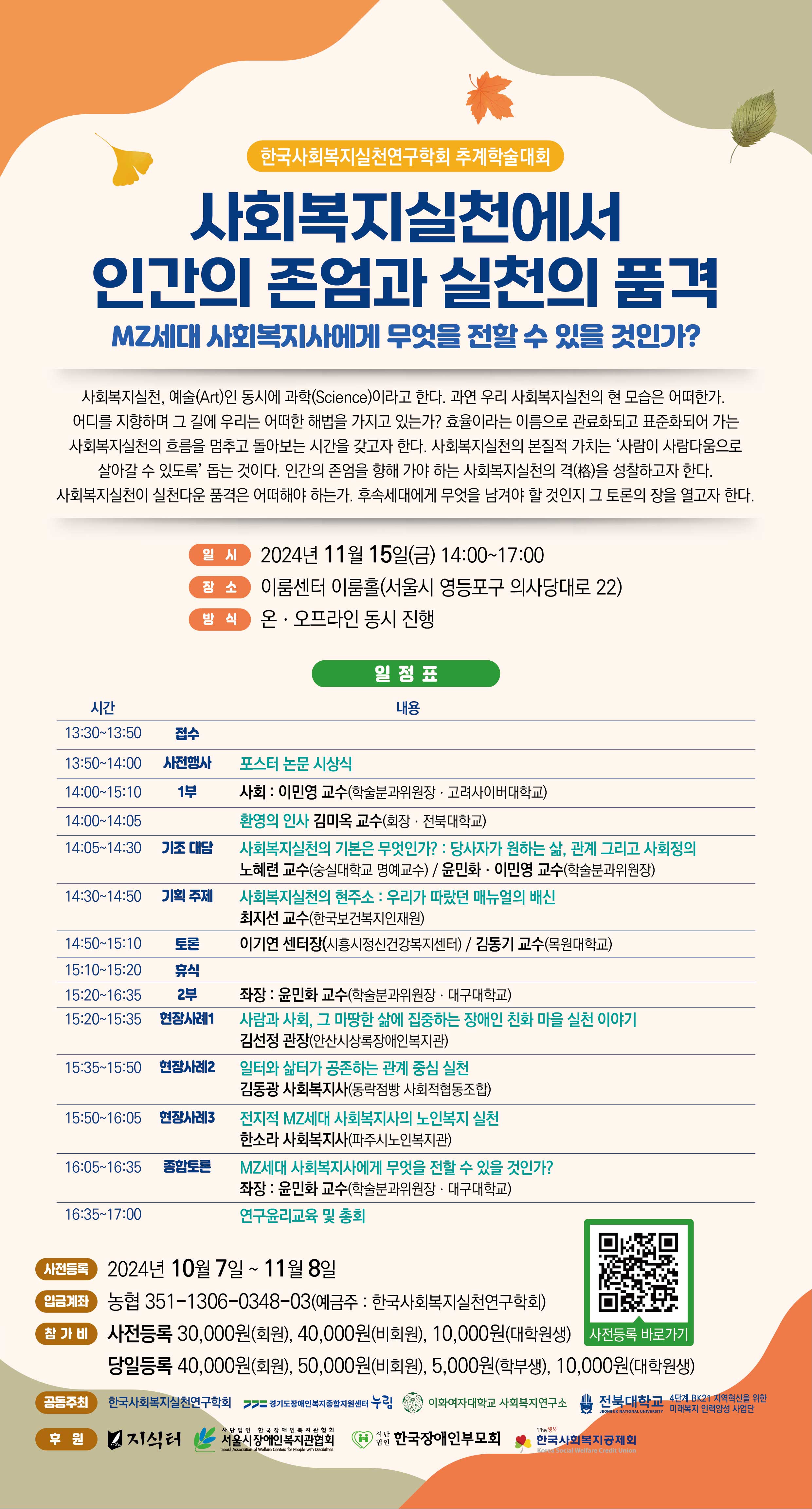 이번 추계학술대회는 "사회복지실천에서 인간의 존엄과 실천의 품격-MZ세대 사회복지사에게 무엇을 전할 수 있을 것인가?“라는 주제로 한국사회복지실천연구학회, 경기도장애인복지종합지원센터 누림, 이화여자대학교 사회복지연구소, 전북대학교 BK21 사업단과 공동주최할 예정입니다.