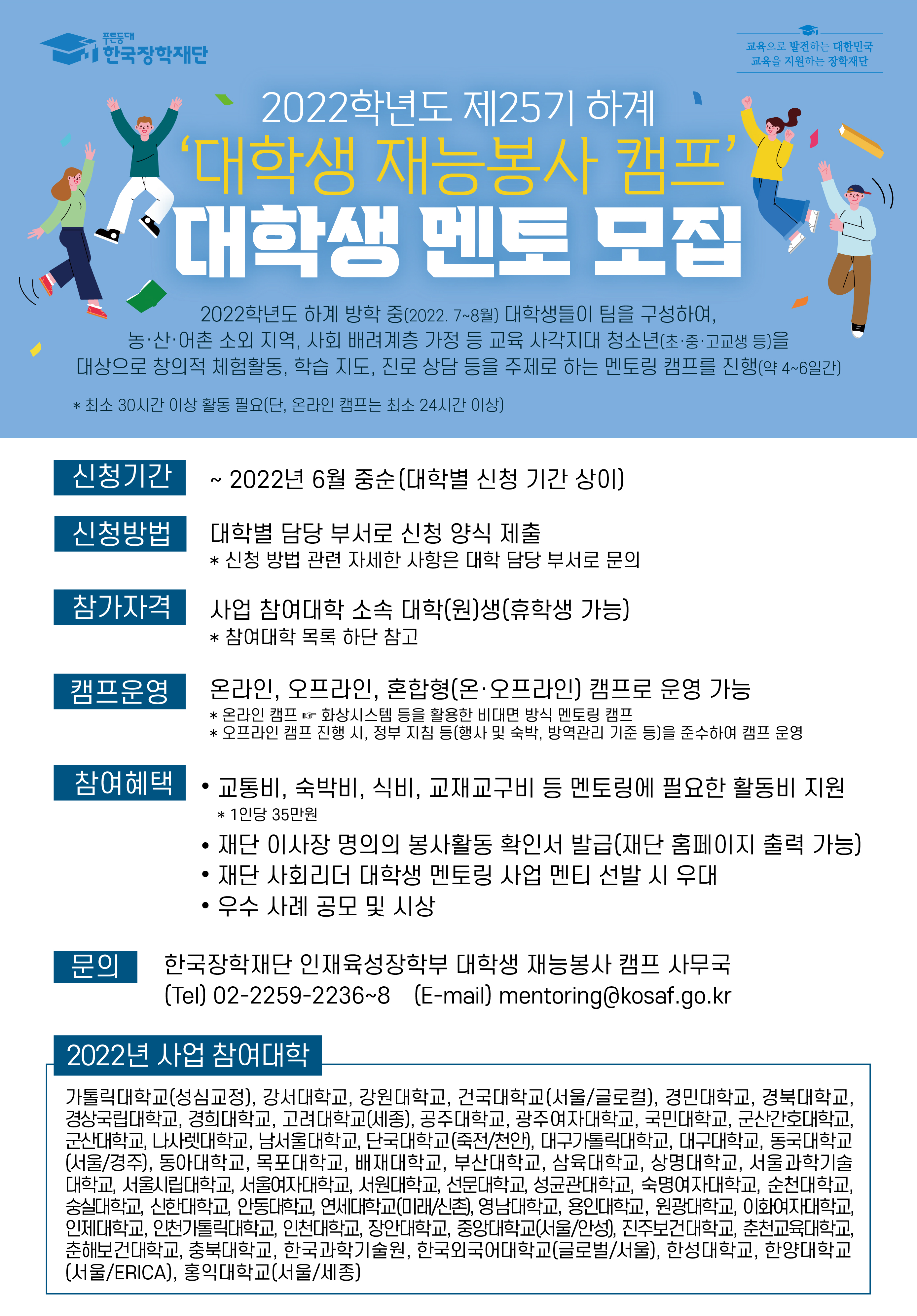 한국장학재단 2022학년도 제25기 하계 대학생 재능봉사 캠프 사업 대학생 멘토 모집 공고